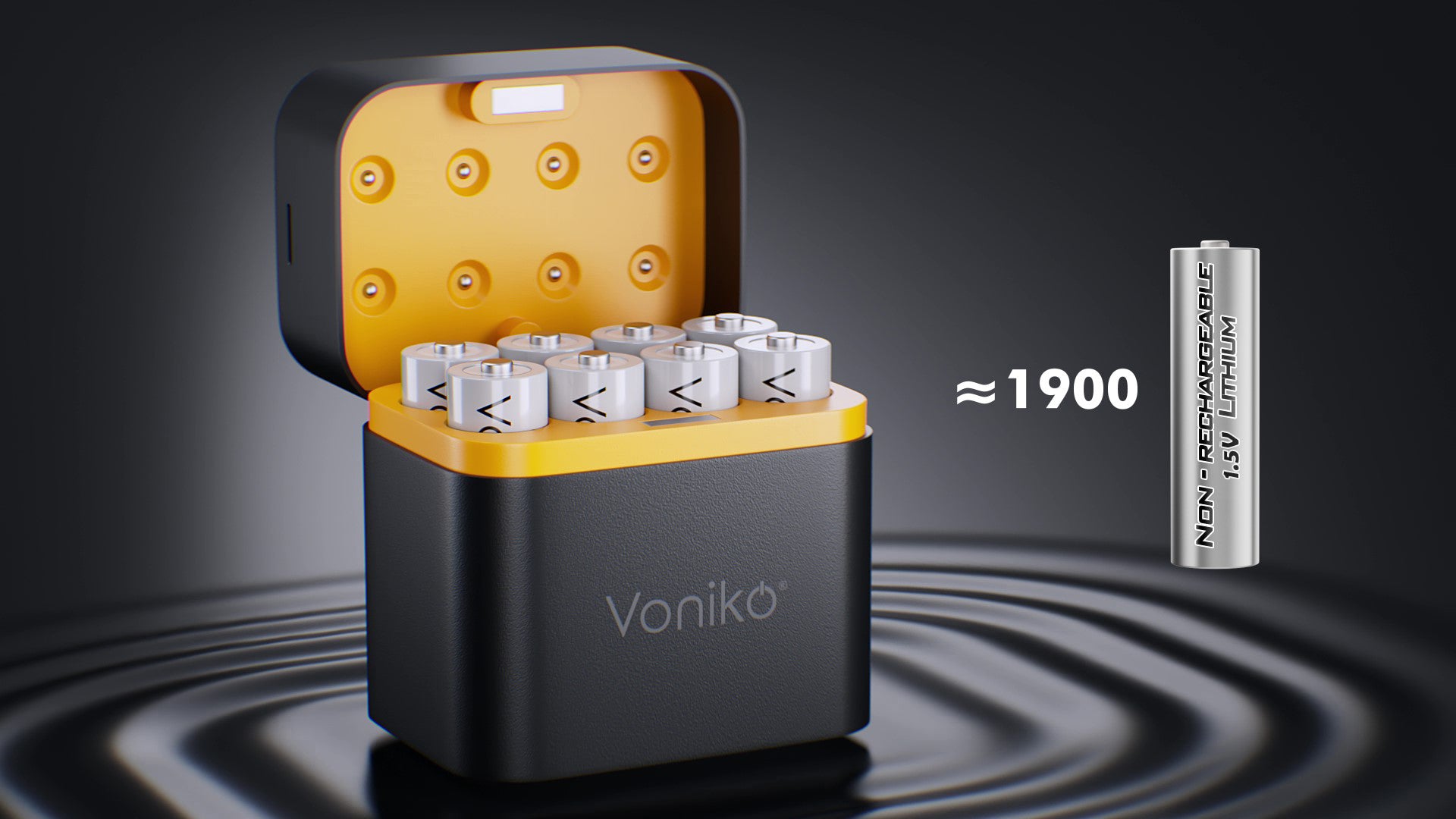 Voniko Lithium AA Rechargeable Batteries combine the best of both worlds: the consistent 1.5V power output of premium alkaline batteries with the cost-saving benefits of rechargeability. It is equivalent to replacing 1,900 disposable lithium batteries—significantly reducing your environmental footprint while saving you hundreds of dollars.