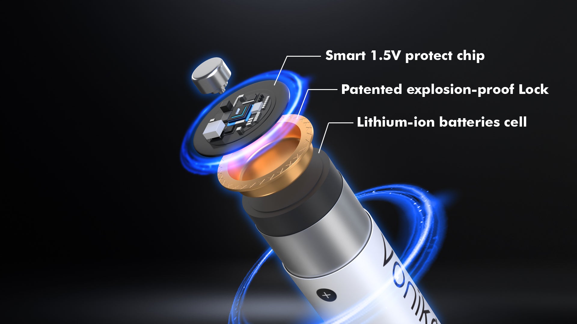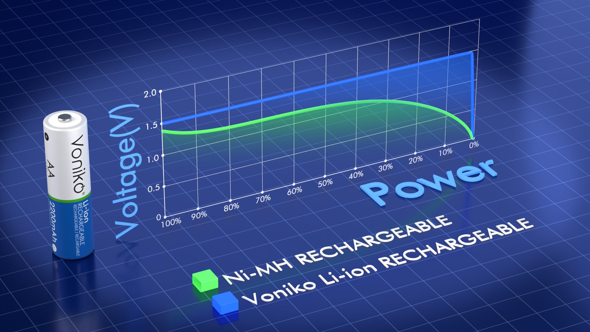 Traditional batteries like alkaline AAs use 1.5V and are measured in mAh. But Voniko rechargeable lithium batteries are different — they have a 1000mAh 3.6V lithium cell inside — that’s 3600mWh of stored energy, and we use smart circuitry to deliver a constant 1.5V output.